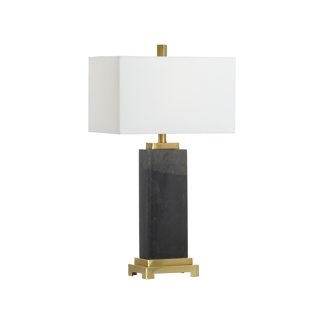 A masculine design combines with feminine accents to create this contemporary table lamp. Black kennedy marble lamp features a rectangular slab of natural black marble juxtaposed by the soft golden accents and elegant off white linen shade.