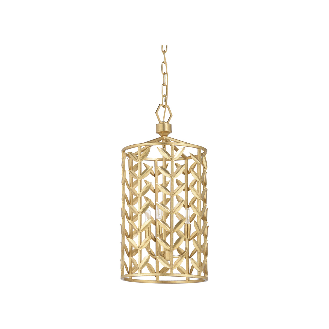 Open metal work lantern featuring stem and leaf detail in gold leaf. Comes with six feet of chain. Designed by Claire Bell.