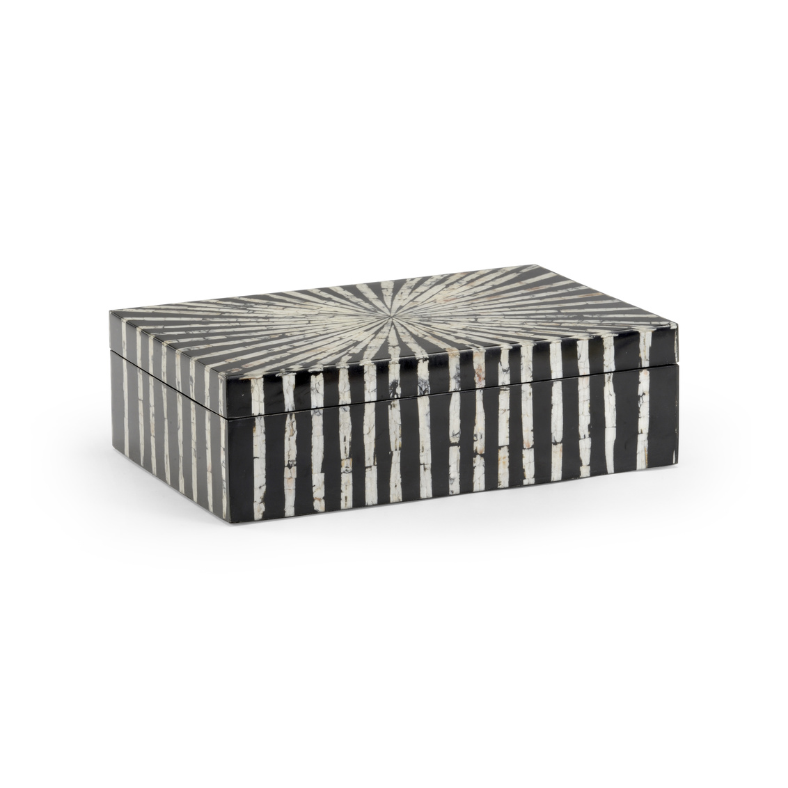 Featuring the elongated rectangular shaped razor shell, this exquisite box has a unique starburst pattern. Crafted of wood with a shell inlay, this black fabric lined box is perfect for hiding the remote control in your beachfront retreat.