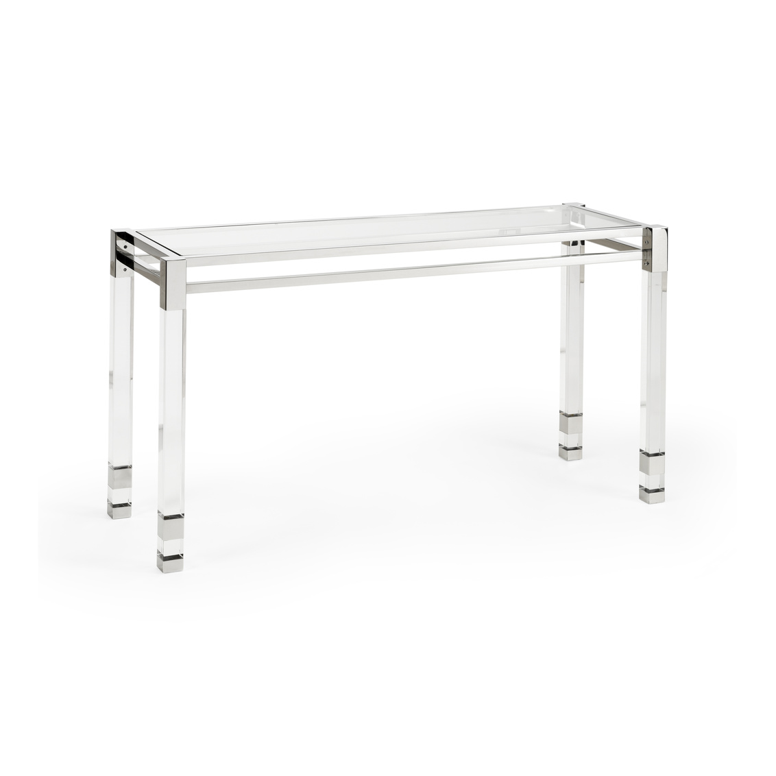 Clean contemporary wall console in acrylic with nickel mounts and a clear tempered glass top.