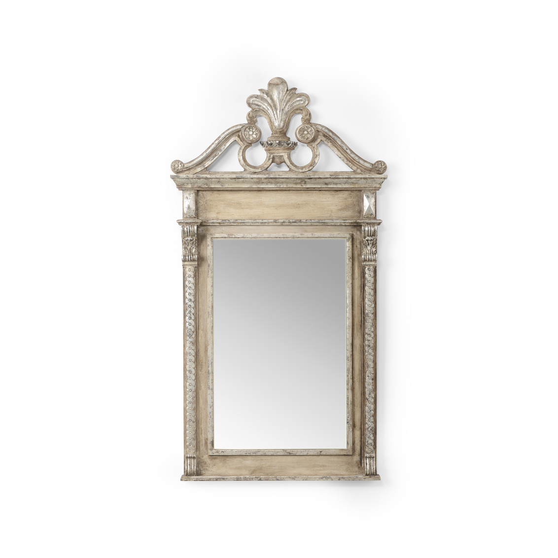 Classic and beautiful wood frame in old world silver with a prince of wales pediment and antique mirror.