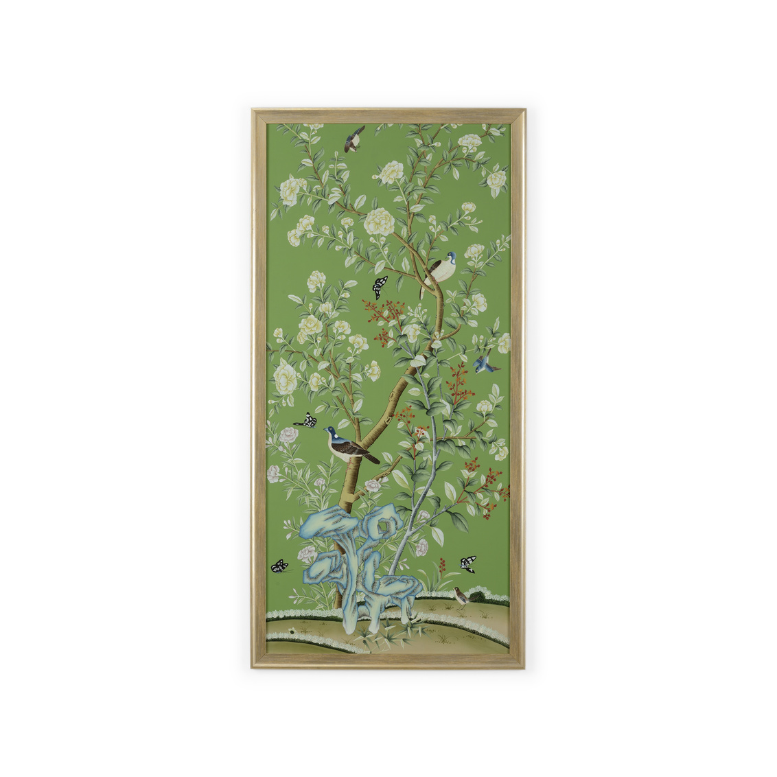 Contemporary gold scoop frame with glass on a silk painting. Hand painted.
