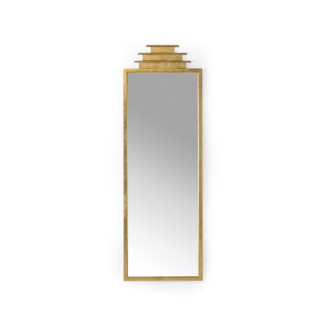 Gold leaf on metal framed mirror with a pagoda inspired top, designed by Jamie Merida.