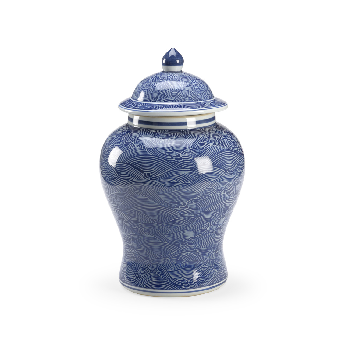 Lidded ginger jar shaped vase with a hand painted wave pattern.
