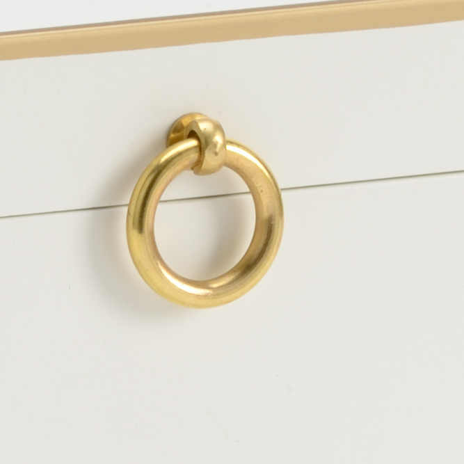 Dress up your entryway console or living room chest with this charming hand painted cream wooden box with antique gold trim. It features bun feet, a round metal handle, a black velvet lining and a hinged lid. Ideal for storing small personal items throughout your home. (Available in other finishes: search rectangular)