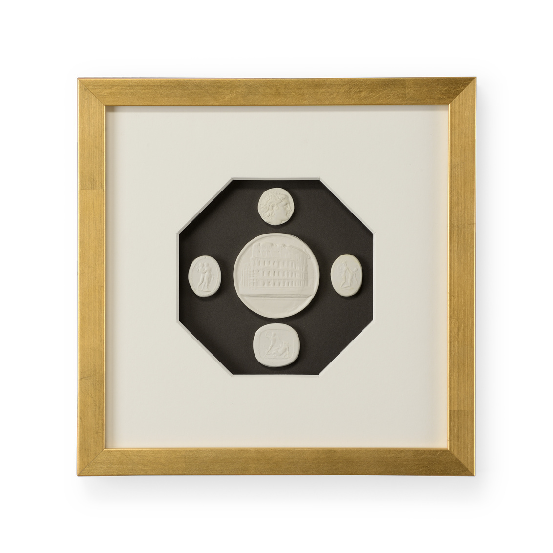 Intaglios on charcoal background mounted under glass in a contemporary gold leaf frame with a 6 ply white mat.
