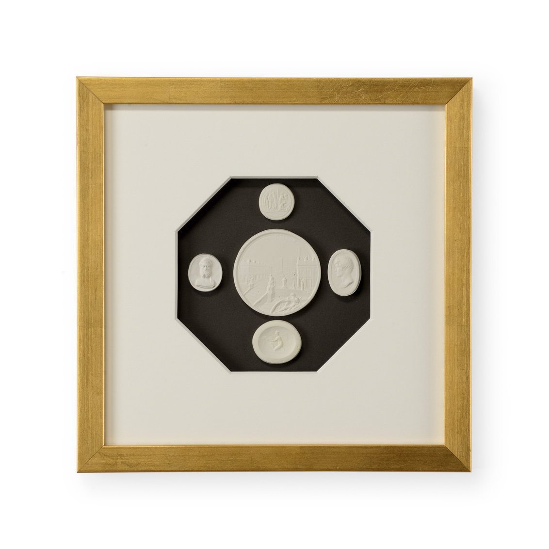 Intaglios on a charcoal background mounted under glass in a contemporary gold leaf frame with a six ply white mat.