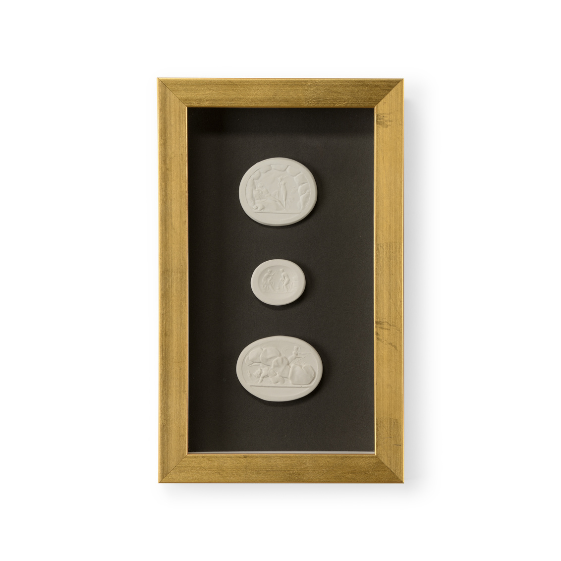 Intaglios on a charcoal background mounted under glass in a contemporary gold leaf shadow box frame.