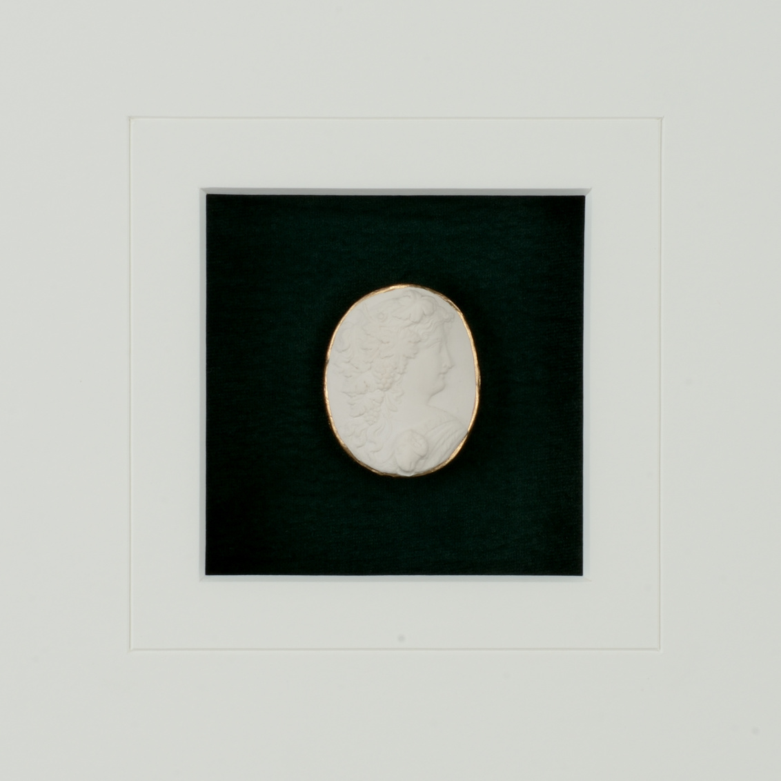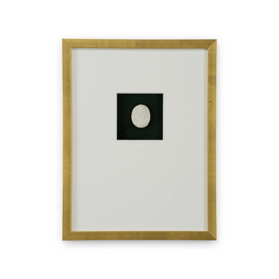 Intaglios on a deep green background in a contemporary gold leaf frame with a 6 ply white mat, under glass