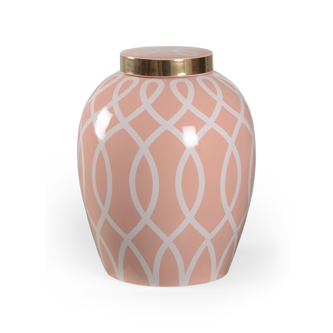 A midsize ginger jar featuring an elongated graceful geometric design in metallic satin gold with a coordinating lid detail. Available in a variety of colors. Designed by Shayla Copas.
