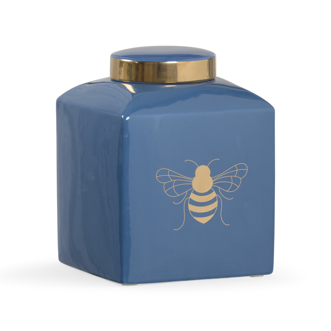 A small version of a traditional ginger jar featuring a royal bee in metallic satin gold to coordinate with the table top version. Available in a variety of colors. Designed by Shayla Copas.
