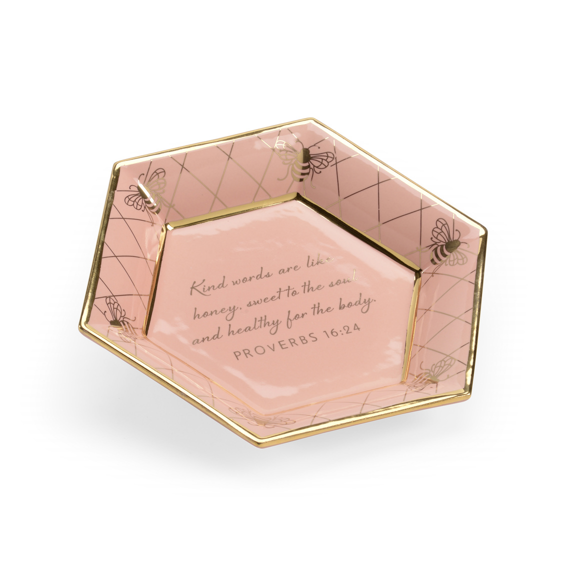 Hexagonal ceramic plate with a metallic satin gold royal bee border pattern including inspirational verse derived from Proverbs 16:24. "Kind words are like honey, sweet to the soul and healthy for the body." For decoration only. Designed by Shayla Copas.