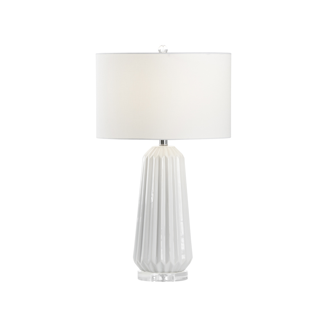 Fine ribbed ceramic lamp in white with nickel accents on crystal base.