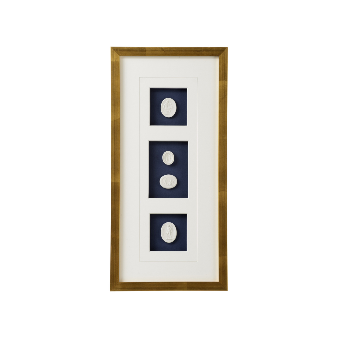 Intaglios on a navy background with an 8 ply mat with v-groove in gold leaf frame. Framed with glass.