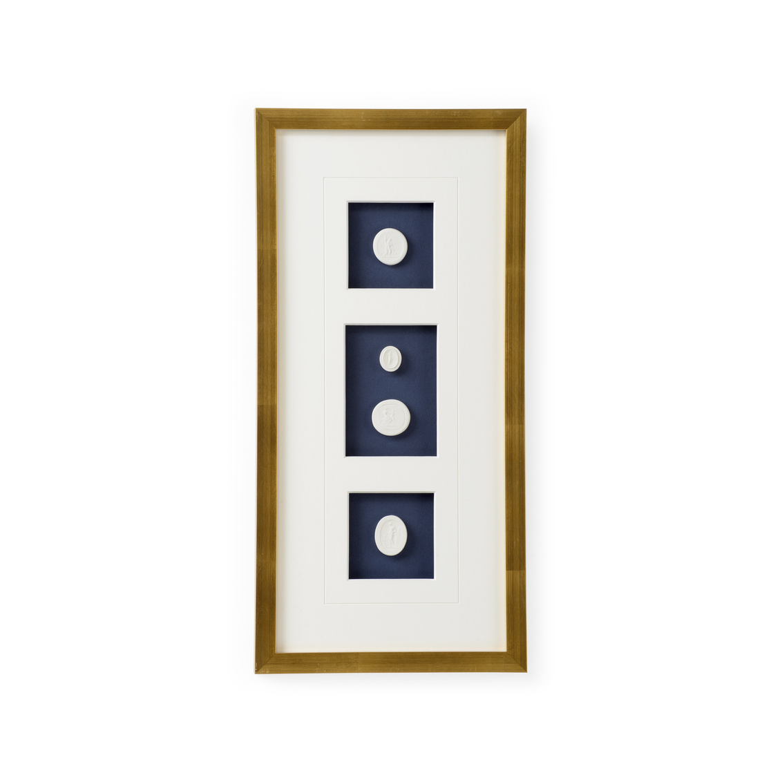 Intaglios on a navy background with an 8 ply mat with v-groove in gold leaf frame. Framed with glass.