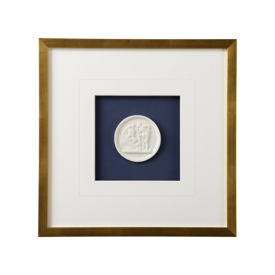Intaglios on a navy background with an 8 ply mat with v-groove in gold leaf frame. Framed with glass.