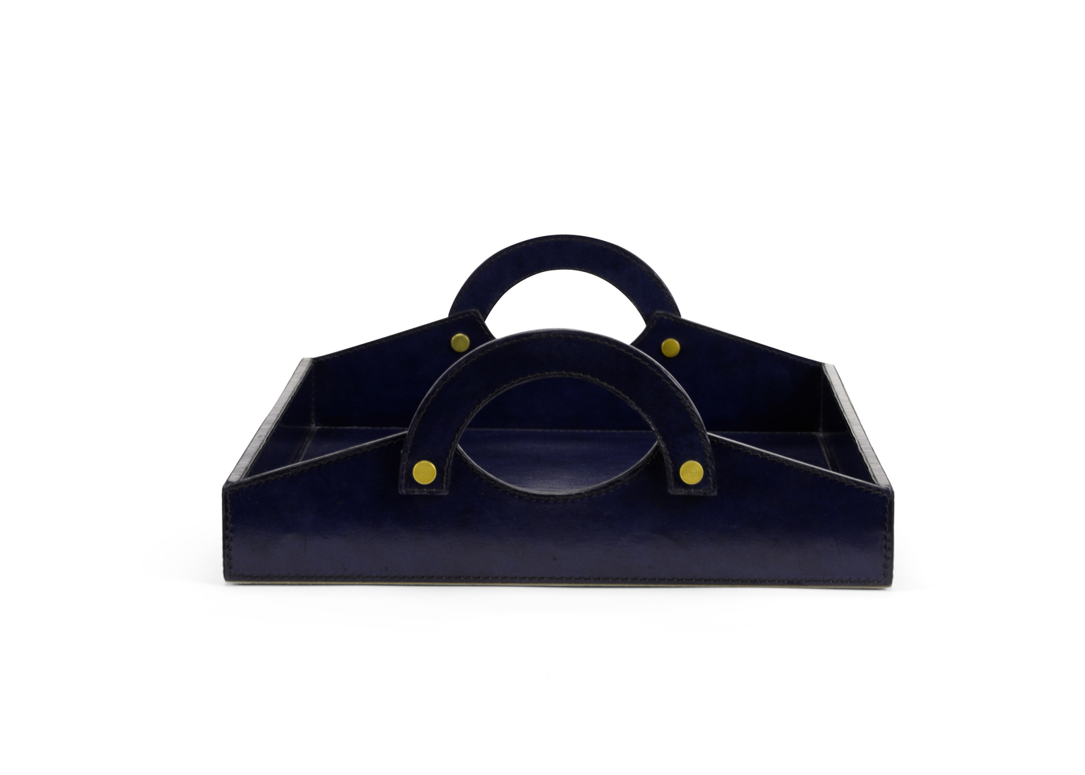 Sleek, classic handcrafted leather tray in rich midnight blue leather with leather handles. A beautiful decorative accent or a luxurious functional tray for entertaining.