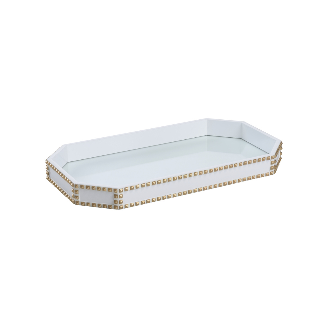 Wood tray with hand applied studs on leather detail. Designed by Shayla Copas.