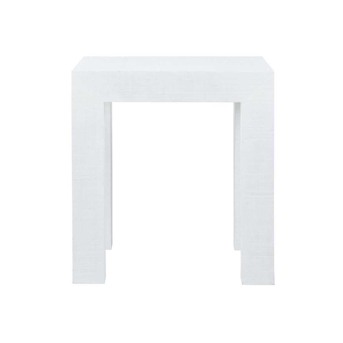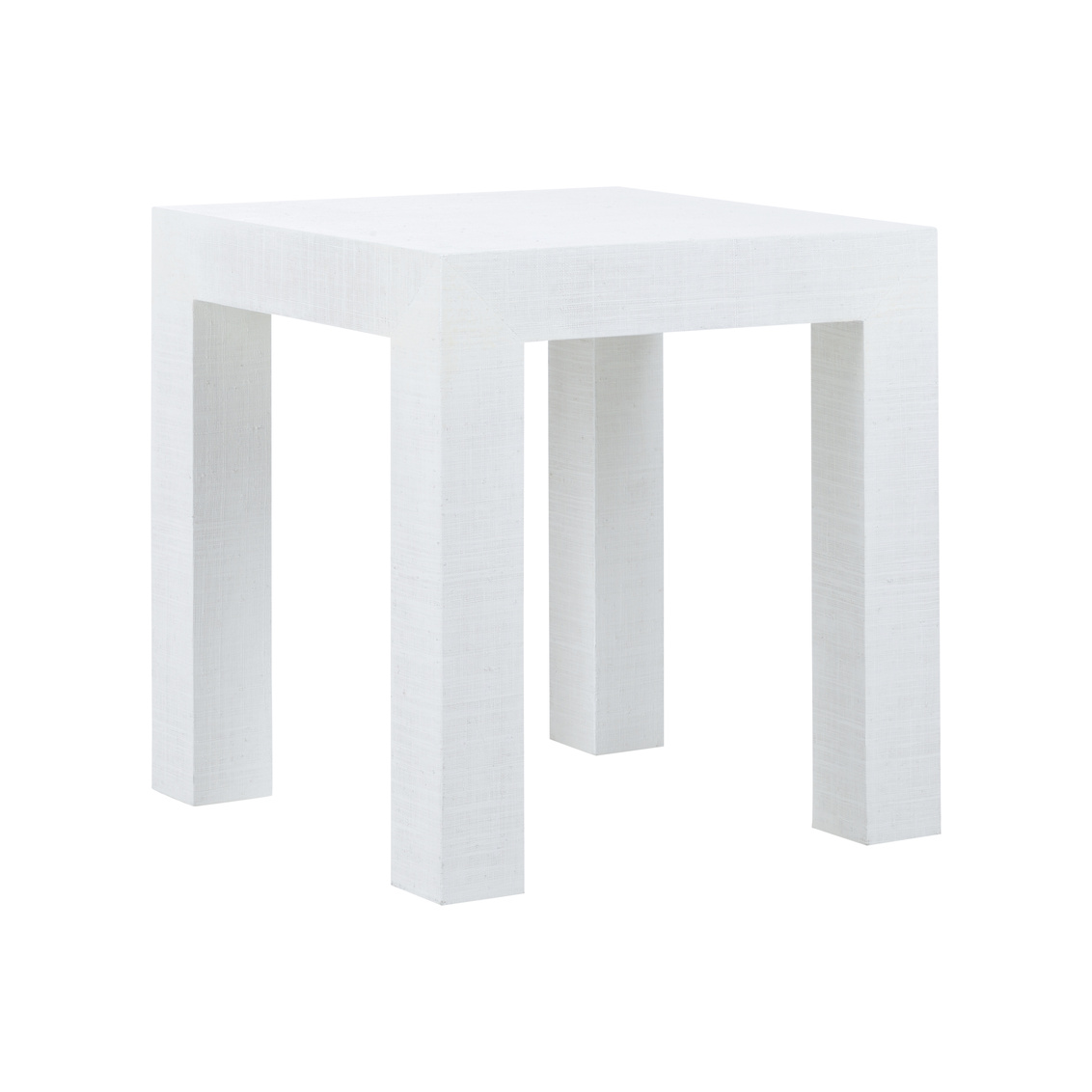 Classic lines make this white raffia wrapped side table easy to use in both modern and traditional settings. It creates a fresh take on the classic Parsons table and will never go out of style. Designed by Jamie Merida.