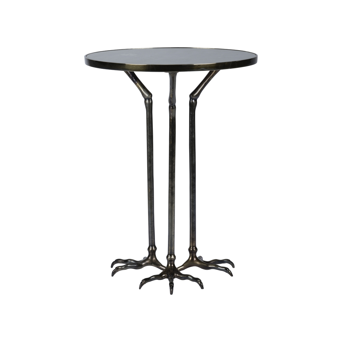 This whimsical and sophisticated side table features bird footed legs finished in antique brass and paired with a natural green marble top.