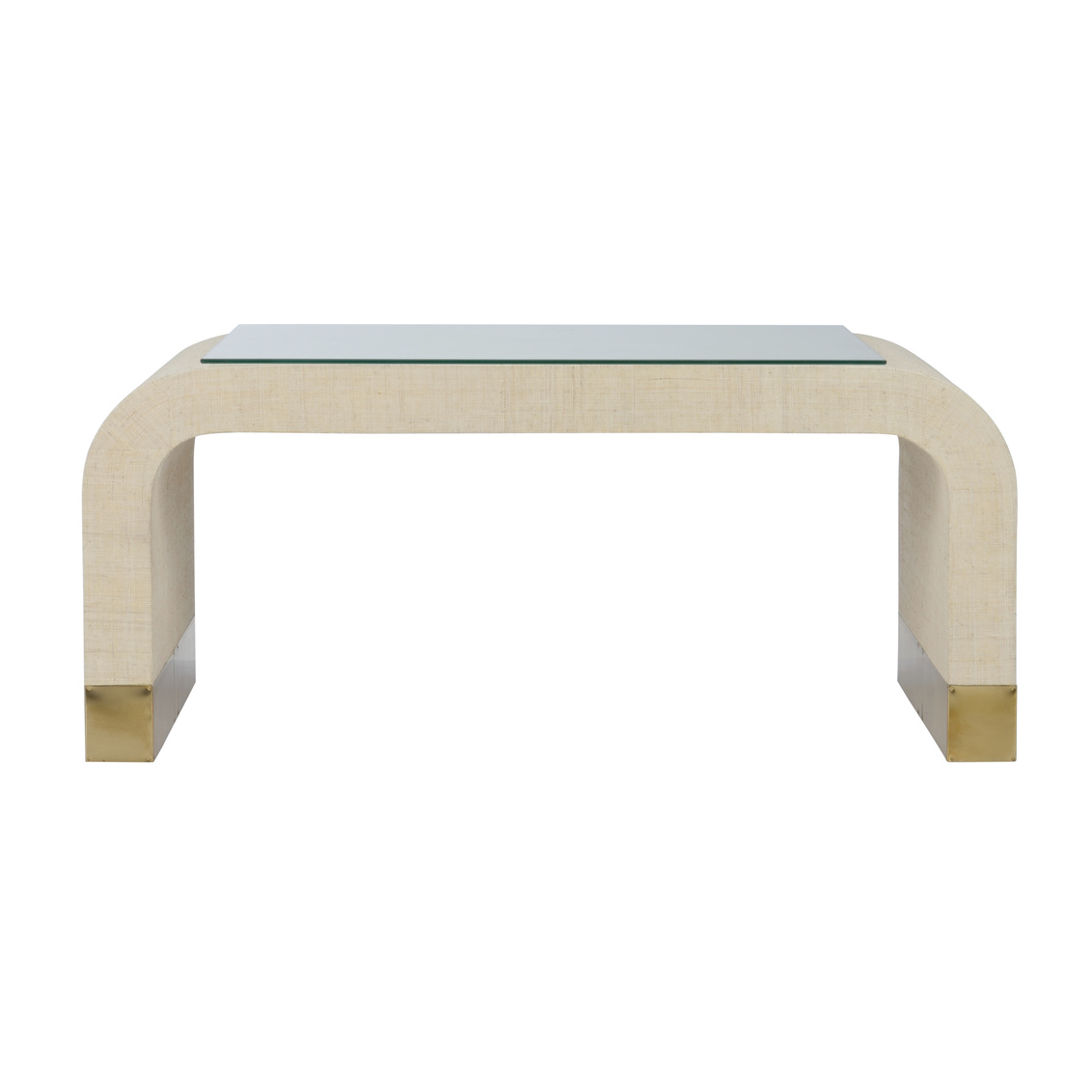 Raffia covered coffee table with antique brass feet. Removable glass top. Designed by Jamie Merida.