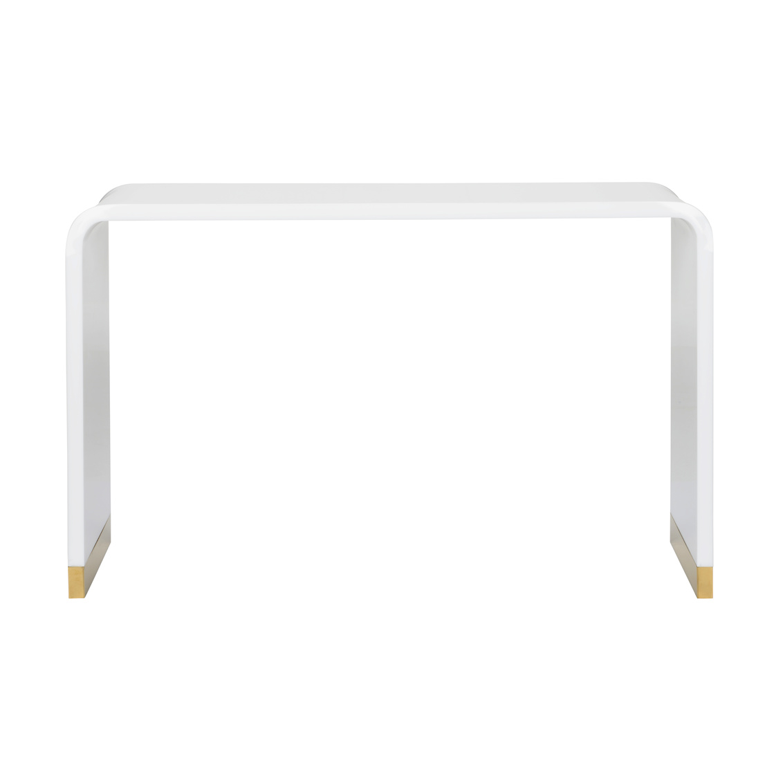 White acrylic console with waterfall edge and polished brass feet. Designed by Bill Cain.