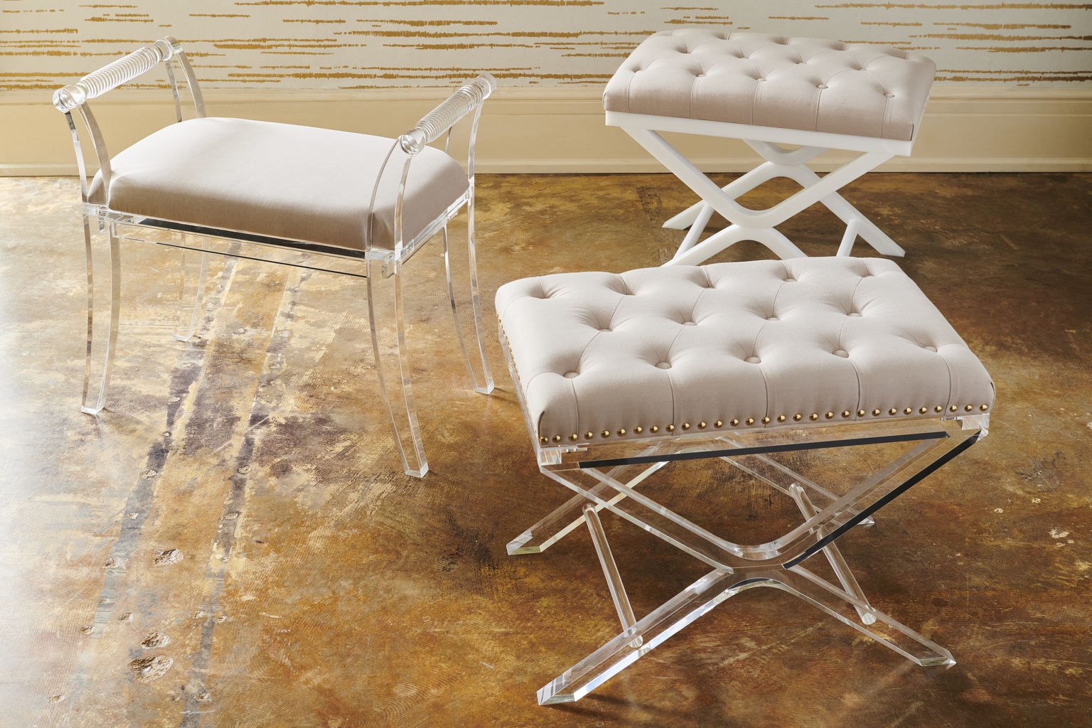 White acrylic stool with tufted muslin seat. Designed by Bill Cain.
