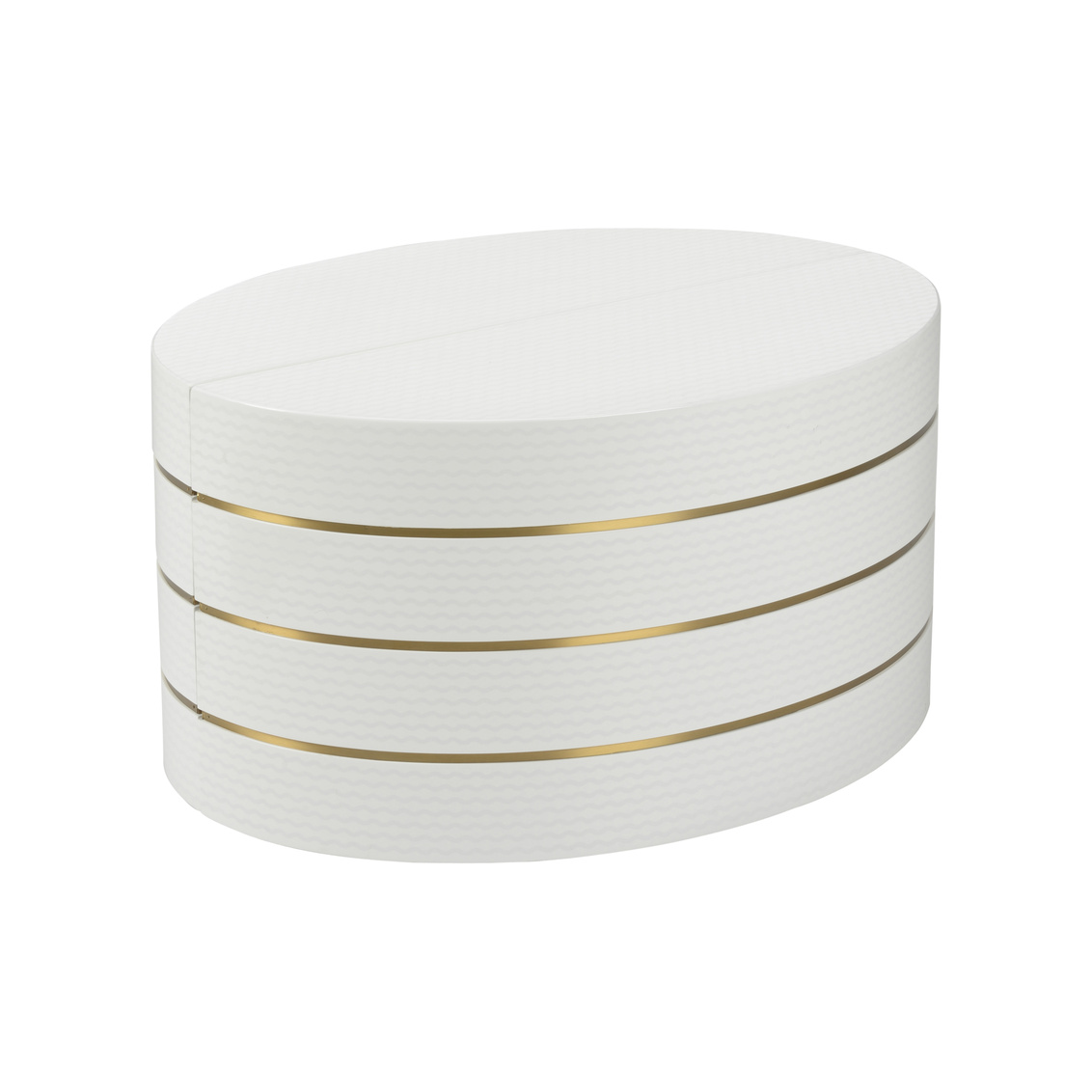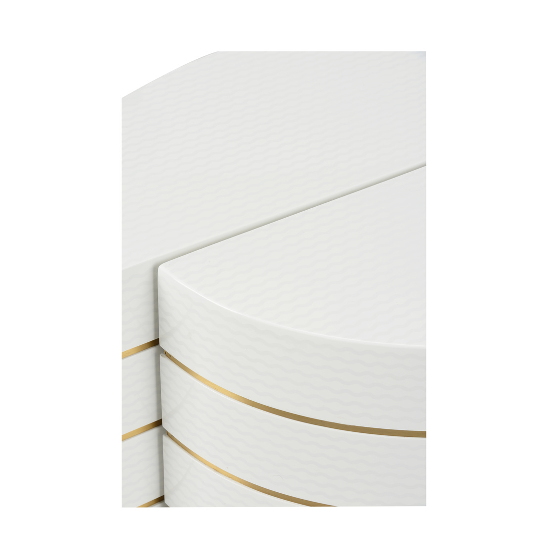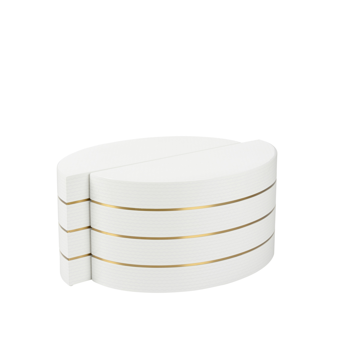 Bring a bold look with our Mezzaluna Bunching Tables. Captivating white lacquered textured weave paneling is finished off with antique... Show more