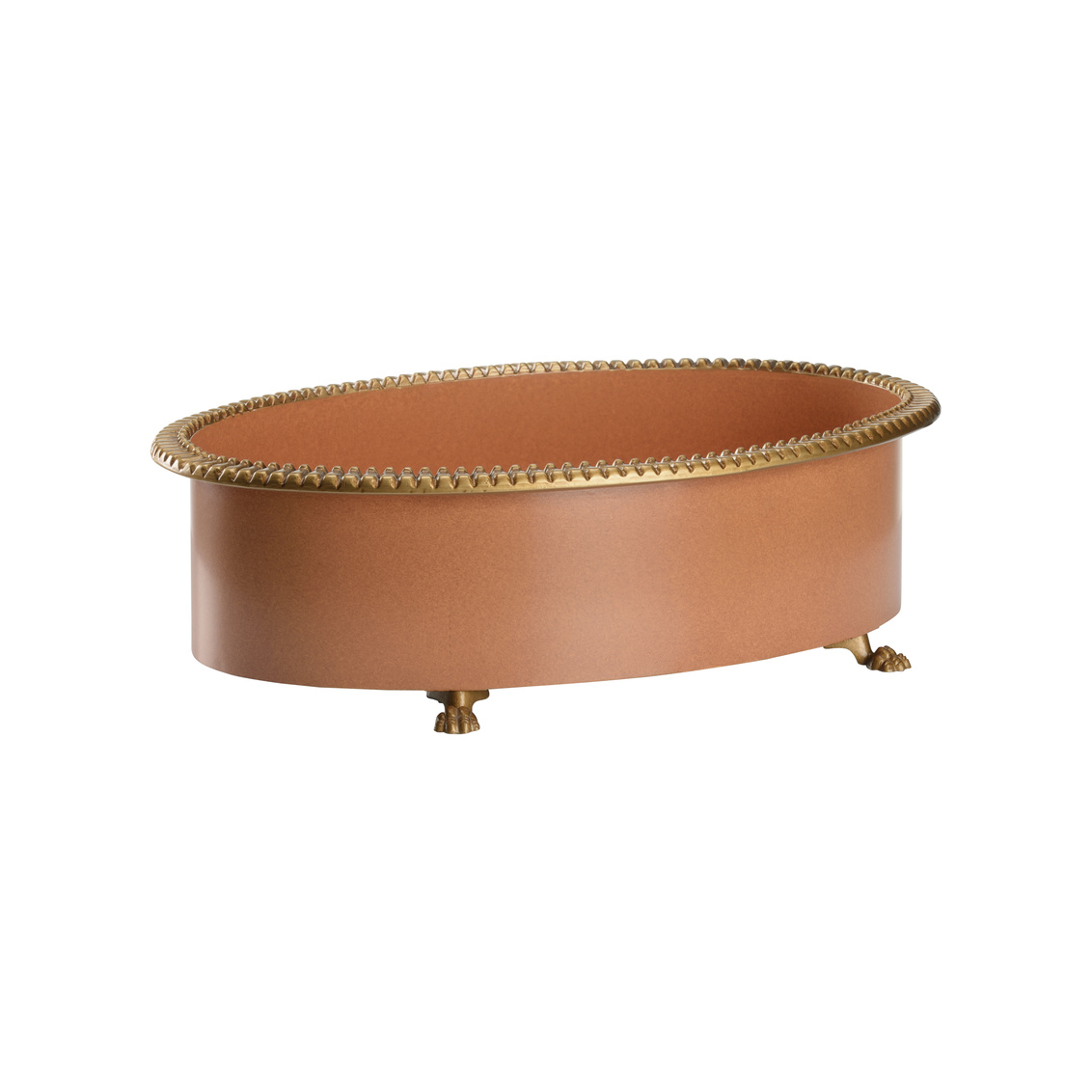 Beautiful oval planter with pie crust edge on gold feet. Designed by Claire Bell.