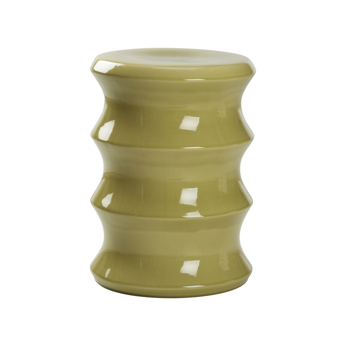 Inspired by bamboo, the Shelbourne Garden Seat is a contemporary stool crafted in a green ceramic glazed finish. Perfect for an impromptu seat or side table. Designed by Jamie Merida.