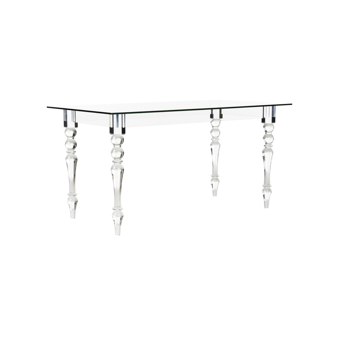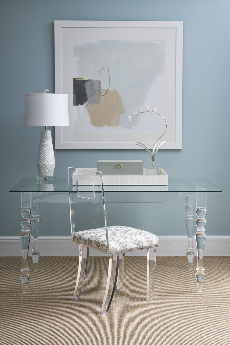 Clean clear lines of acrylic, rounded fluted legs and a glass top highlight the neoclassical aesthetic of this piece which can be used as a desk or small dining table. Sophisticated details create a statement piece for any room.