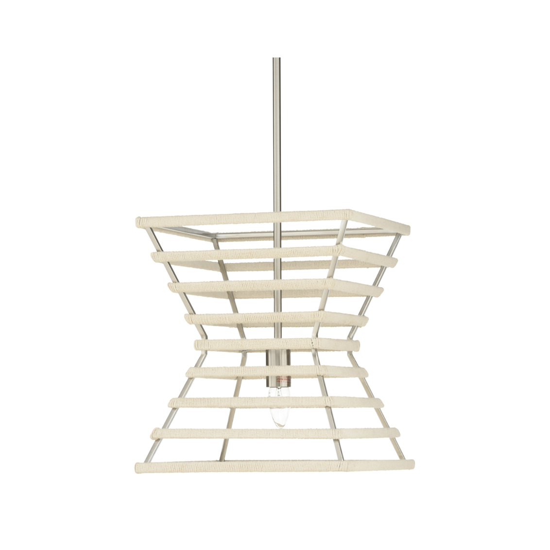 Bold with a sleek silhouette, the Rope Pendant makes a statement with pearlescent white rope wrapped around an hourglass shaped metal base with nickel finishing. It's the perfect fit for a modern or transitional setting. Designed by Elizabeth Wicker.