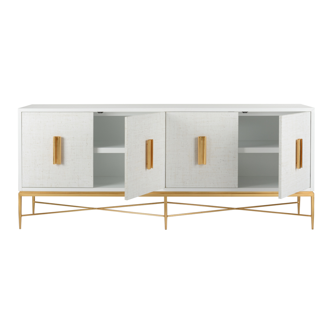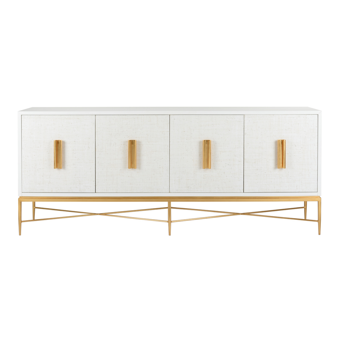 Meticulously crafted with clean lines, the Williams Console uses wood and white grass cloth doors for a dazzling mix of materials. Antique gold details finish off this beautifully modern cabinet. Designed by Bill Cain.
