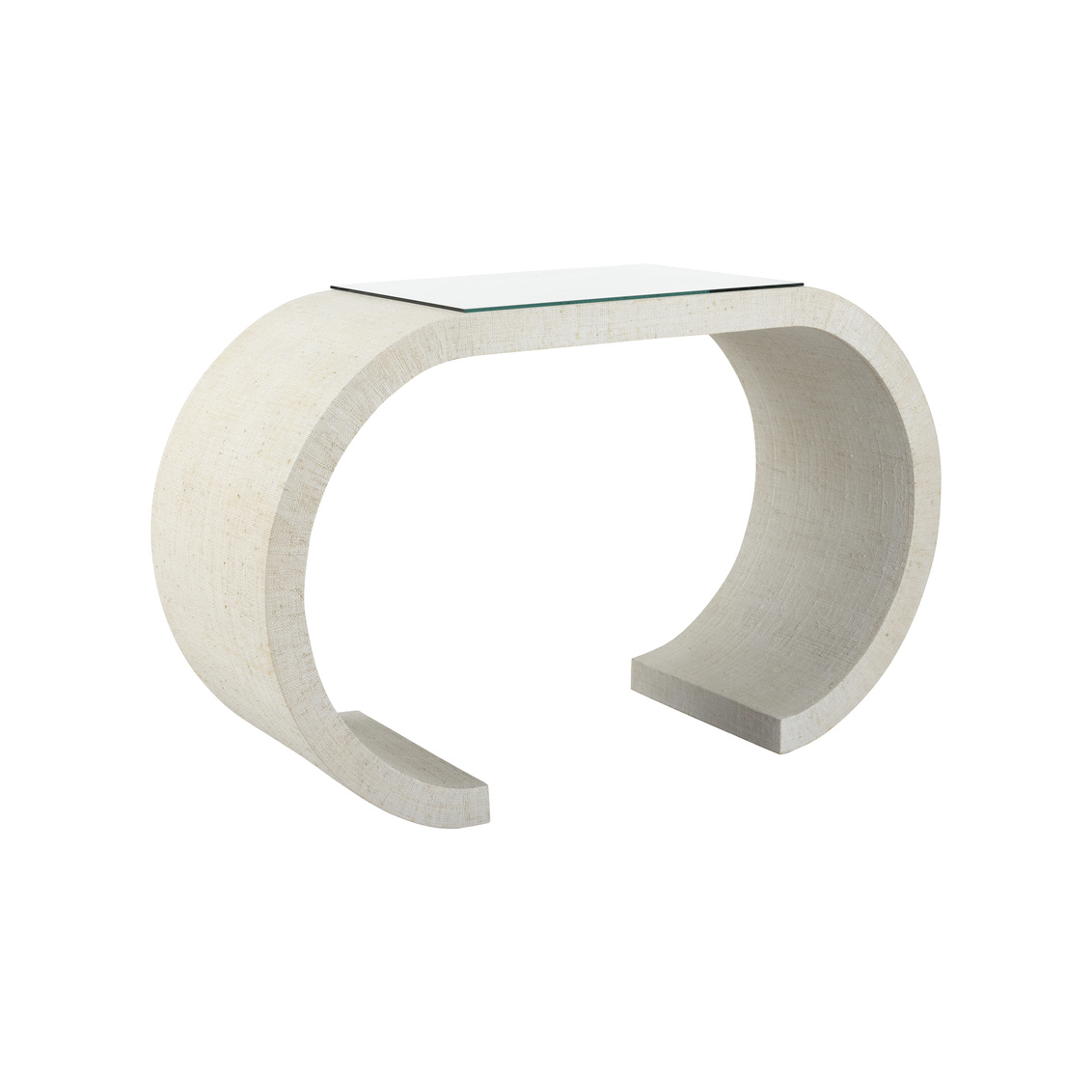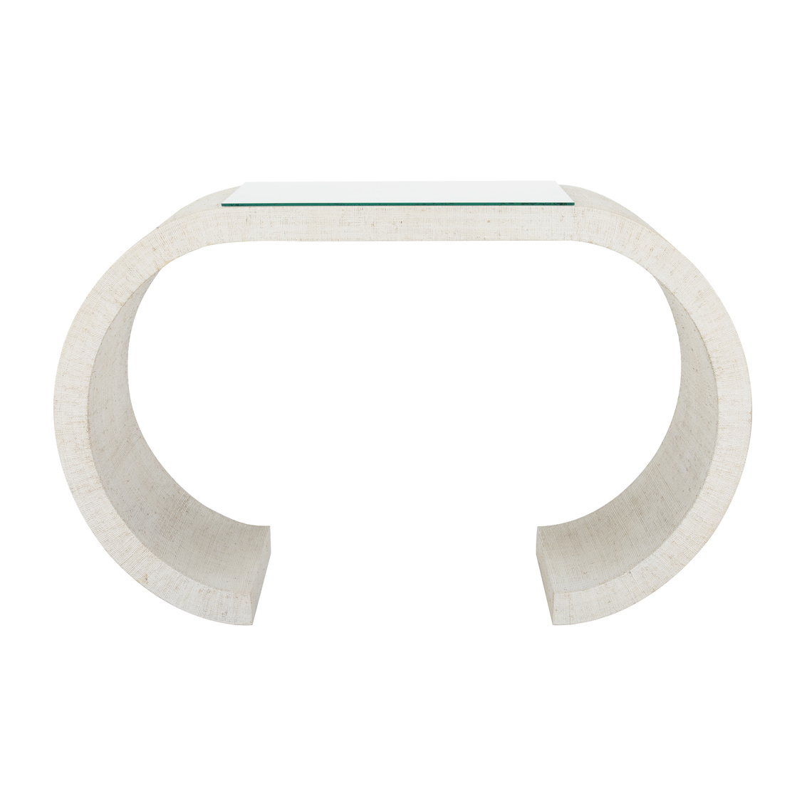 The Bridgers Console's striking design brings a big impact in a small, scaled piece. The shapely rounded arched legs and grass cloth wrapped body finished in white create an eye-catching piece for a small entry room or wall. Designed by Bill Cain.