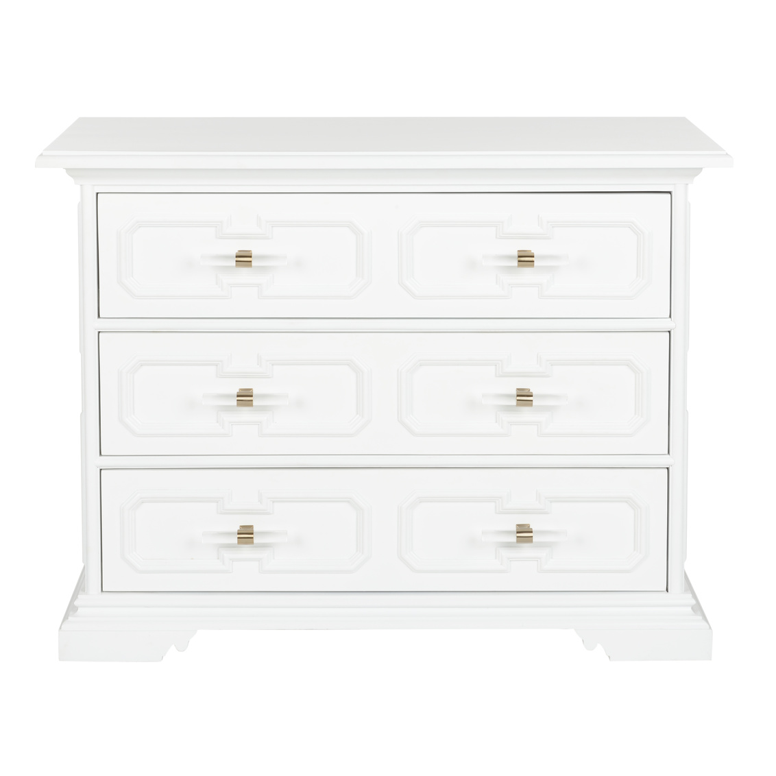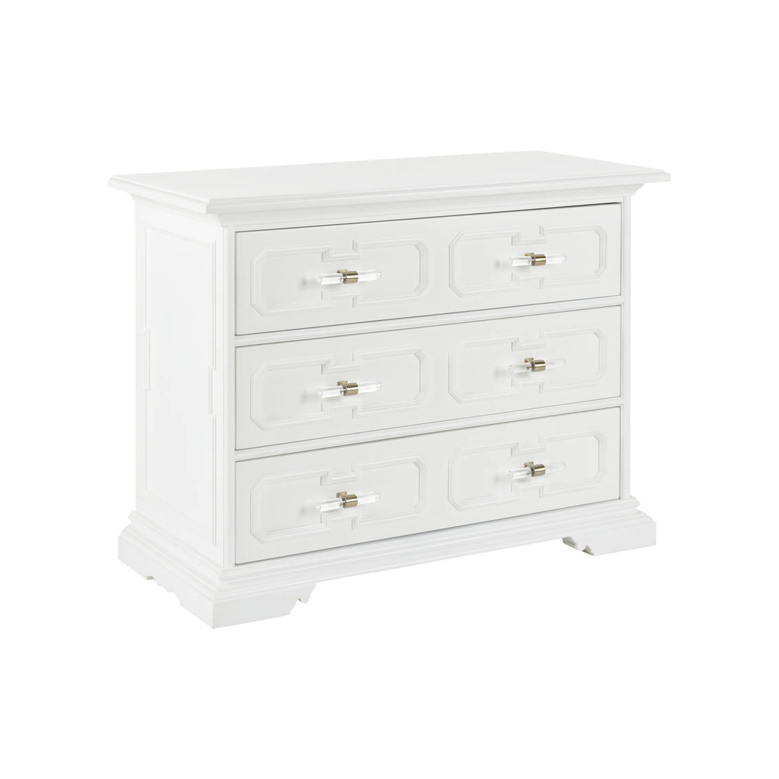 A fresh perspective that was inspired by a classic piece, the 3-drawer River Steet Chest is an inviting silhouette with a garden trellis design finished in white lacquer and modern acrylic handles. Perfect for any entryway or living room. Designed by Bill Cain.
