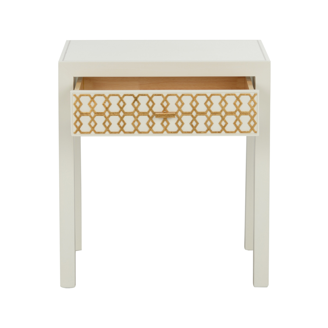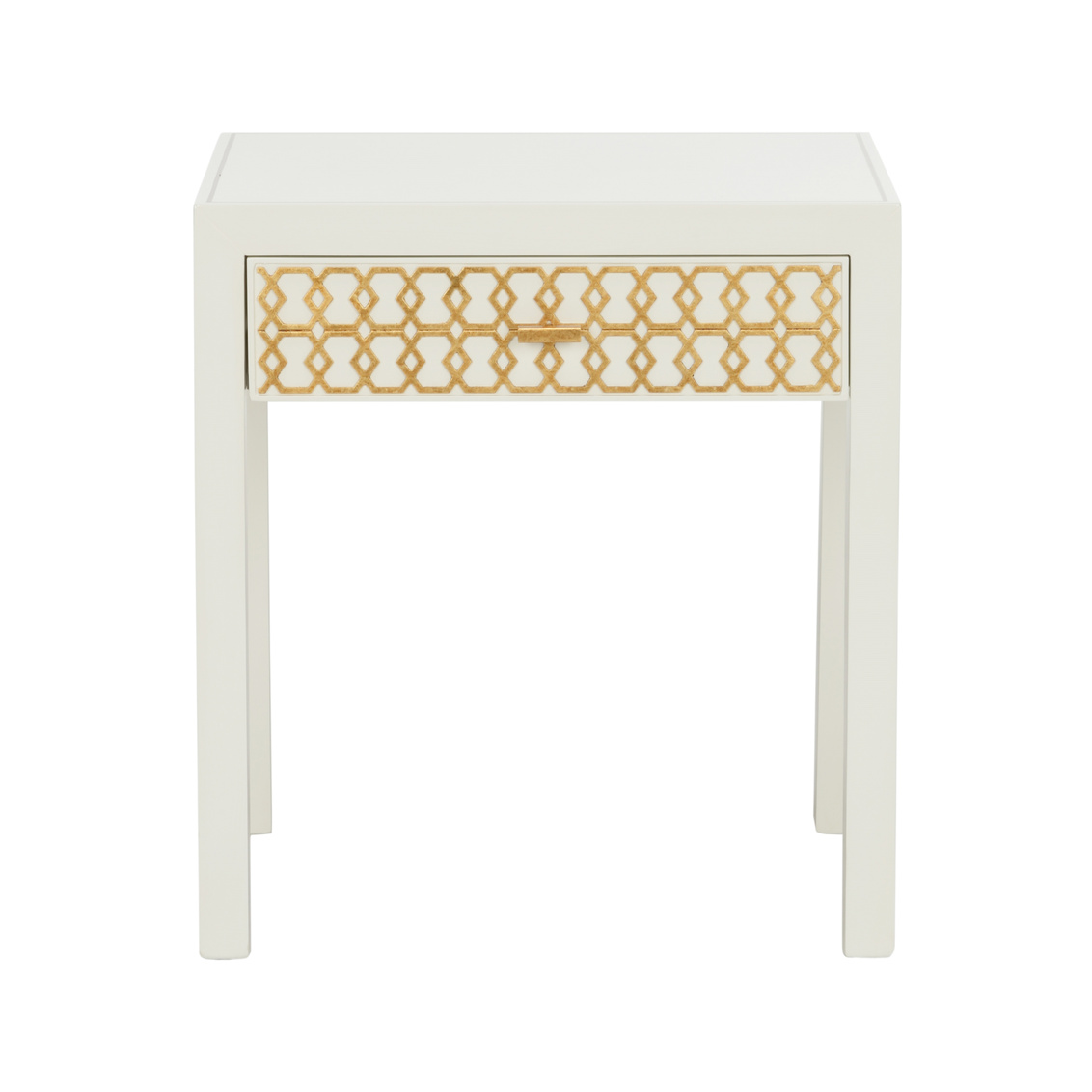 The Hazel Nightstand borrows its shape from a simple side table, but adds charisma with a metal satin gold honeycomb pattern on the front drawer that pops off the white finish. Designed by Shayla Copas.