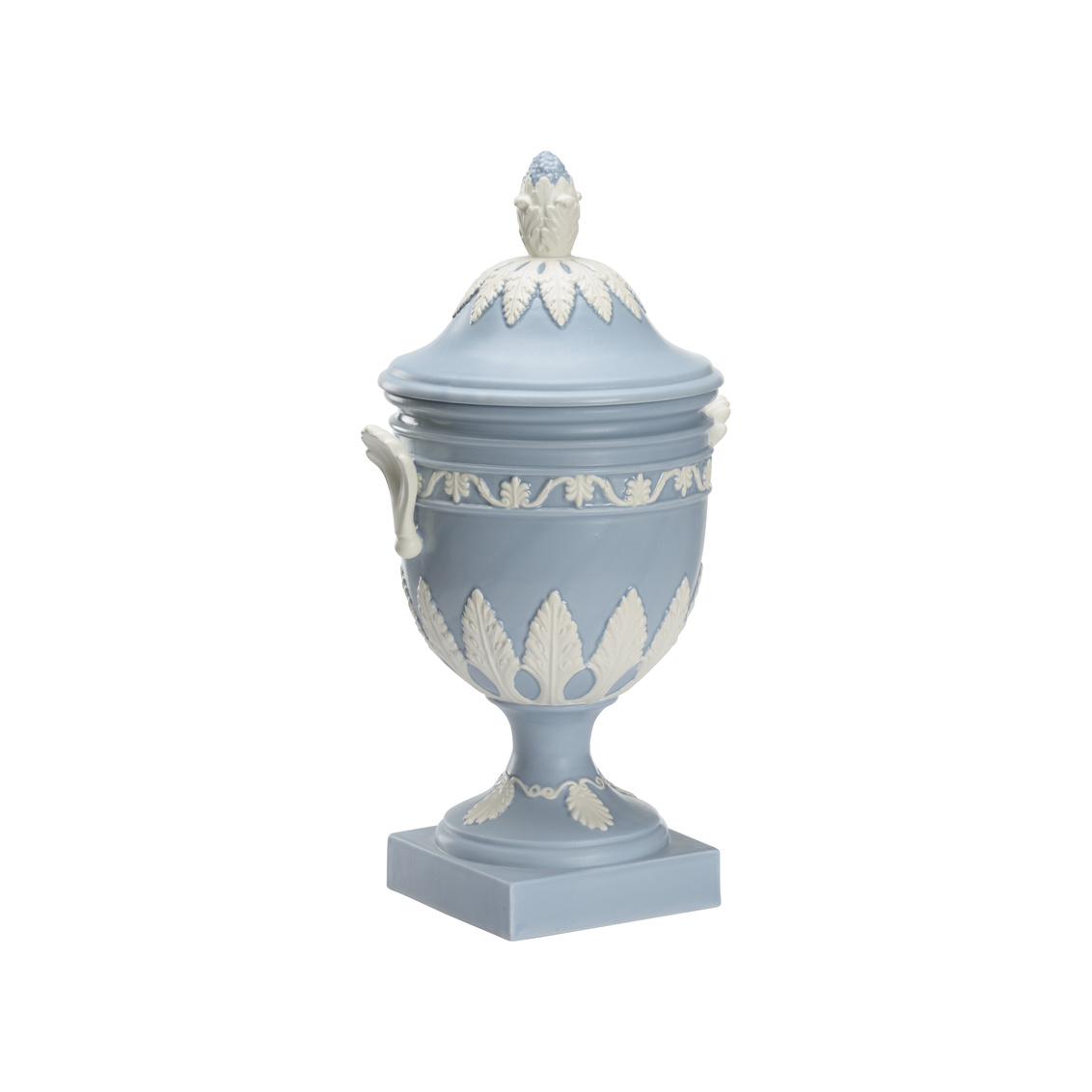 Graced with touches of white, the Wedgewood Urn in blue is an elegant and classic shape that can be used on bookshelves or tabletops.