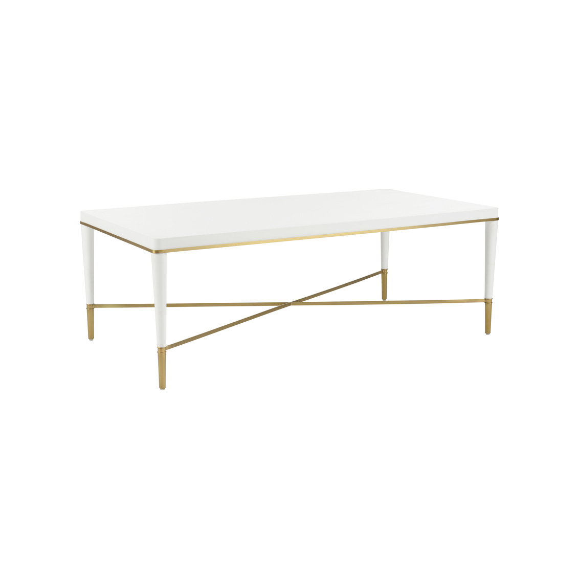 The Hamlet Cocktail Table features a clean-lined white finish that is a perfect blend of modern simplicity and understated elegance. Crafted with a smooth, pristine finish, the table features a minimalist design that effortlessly complements a variety of interior styles. Its sleek white surface is beautifully contrasted by gold-capped feet and stretcher, adding a touch of glamour and refinement.
