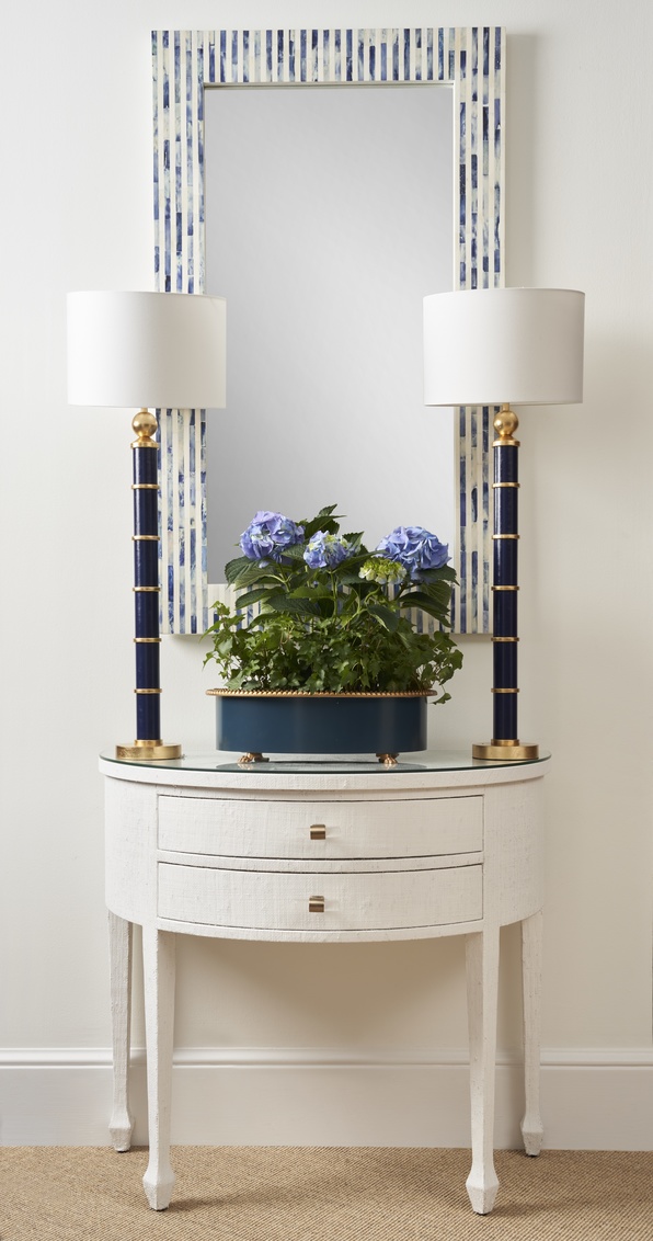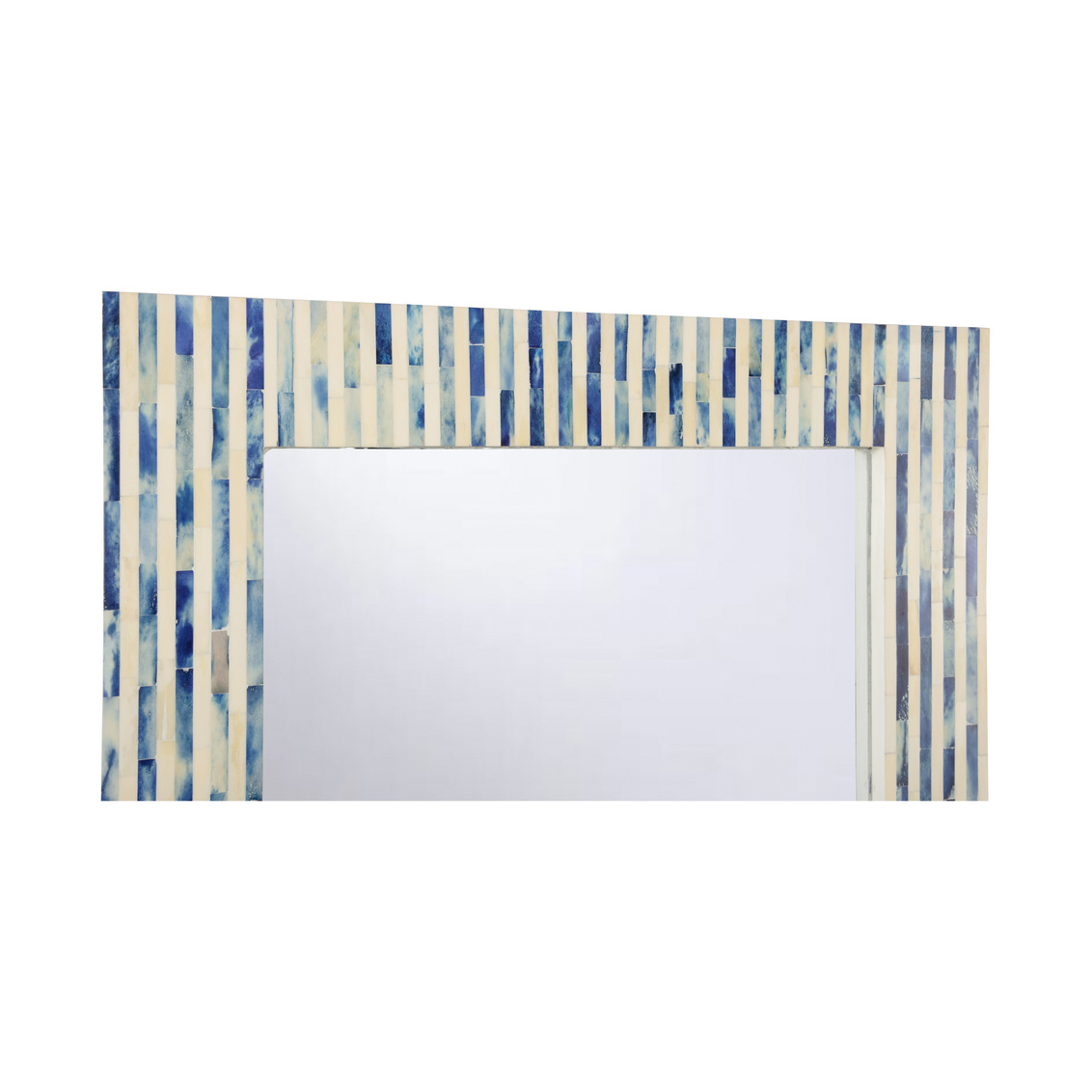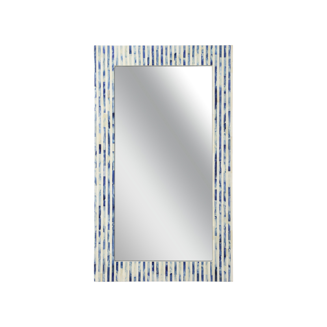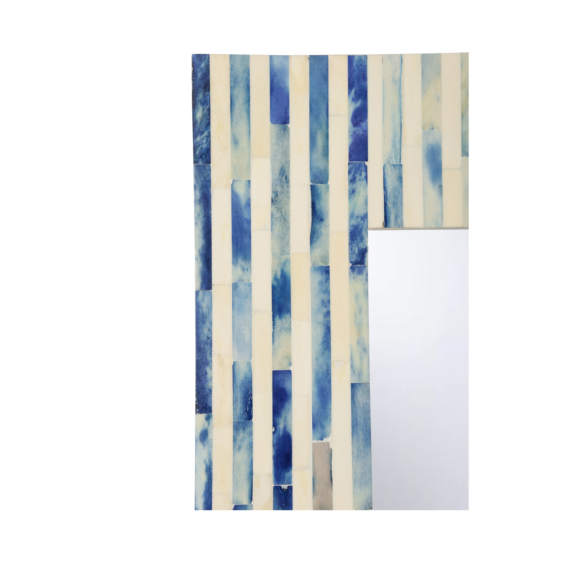The Cambridge Mirror is surrounded by a beautifully intricate bone inlay frame, hand-cut and meticulously arranged in a stunning pattern that contrasts rich blue hues with crisp white tones. The delicate design adds depth and texture, making this mirror not just a functional piece but a striking statement for any room.