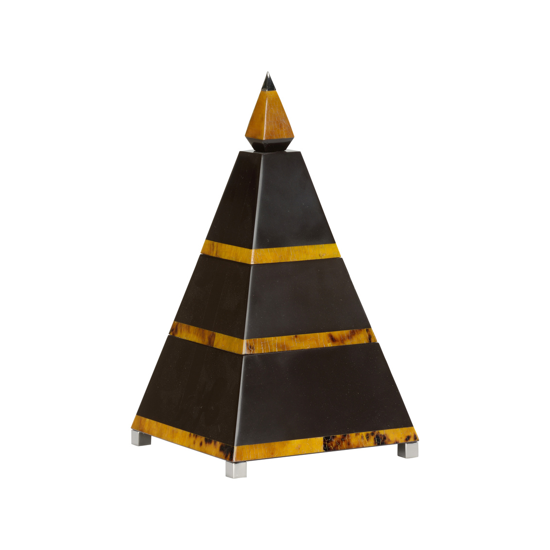 Just like the Great Pyramids of Giza, the Pyramid Box has mysteries. Each section made of brown resin is a small box for storage. Beautifully finished with nickel plated handle and feet with cracked yellow tiger penshell details. Perfect for displaying on a coffee table.