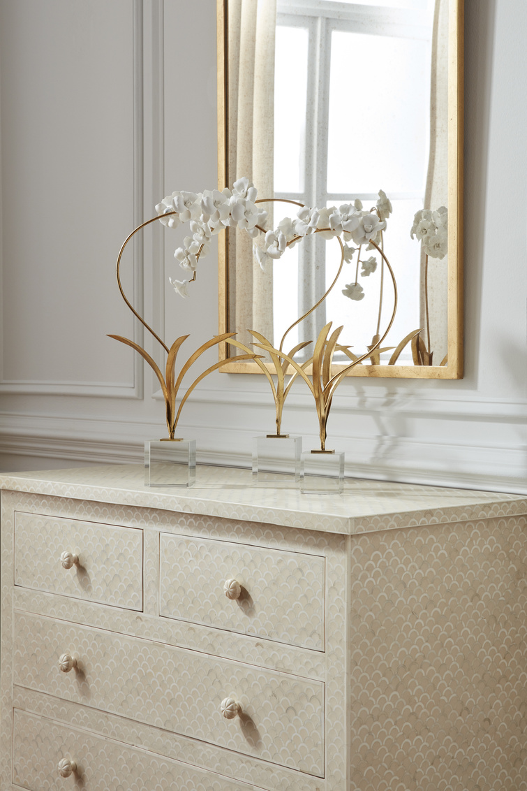 Create a unique and beautiful focal point in your home with this artistic chest. The Milford Chest features a natural and white bone fish scale pattern hand laid by skilled artisans. The sophisticated artistry and natural characteristics of the bone make each piece unique. This four drawer chest is ideal for a bedroom, entryway or living area. Top with a chic lamp and an accent piece to complete your coastal decor. Not intended for clothing storage. (Top drawers: 4"h x 14.75"w x 11.75"d, bottom drawers: 4"h x 34"w x 11.75"d)