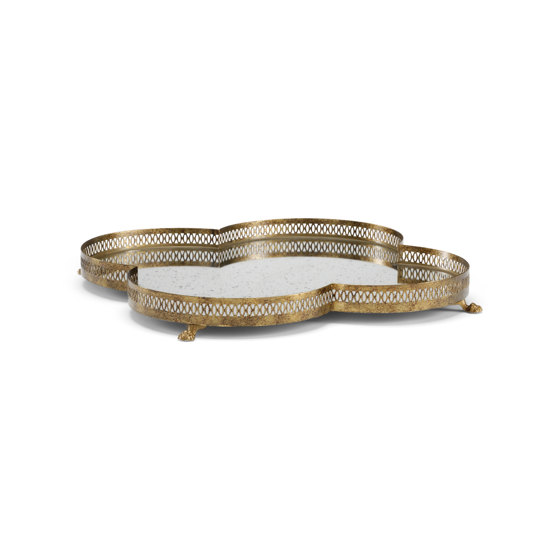 Tracery Mirrored Tray is crafted of tole and features a quatrefoil design. Detailed old gold filigree trim and claw feet combine with an antique mirror to form a traditional tray for your home. Used as a stand-alone on a table or bookshelf or add your favorite decorative accessory and see it reflected in this unique mirrored tray. Designed by Lisa Kahn.