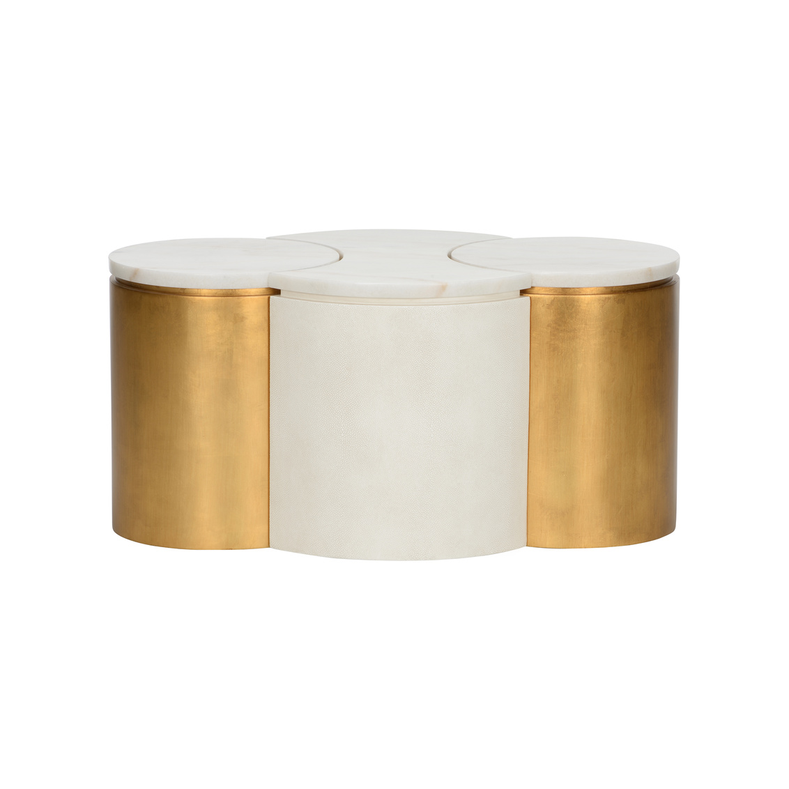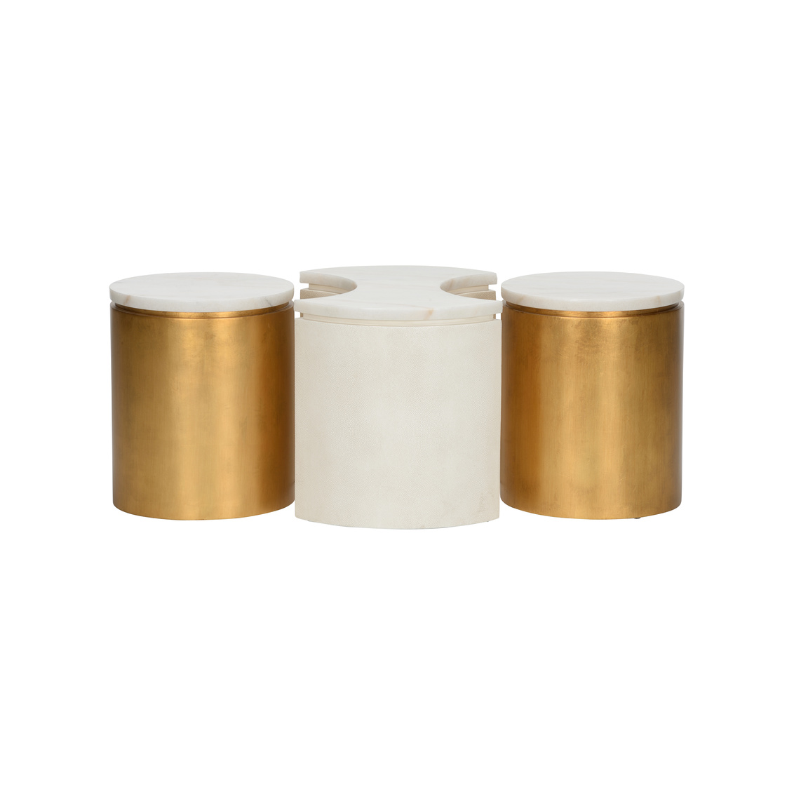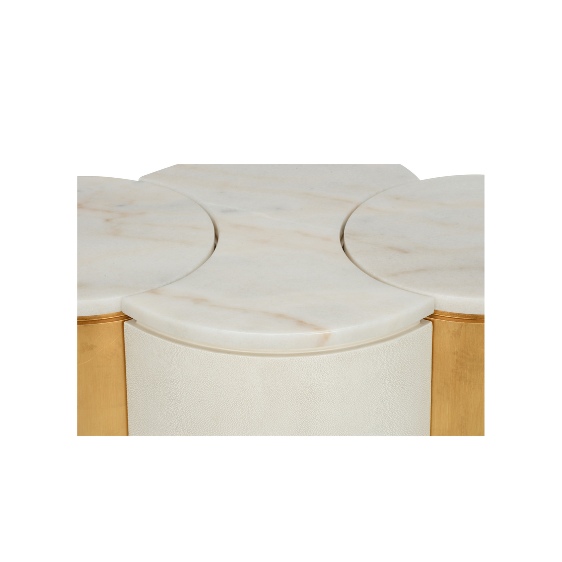 The Chain Table Set serves as a centerpiece, adorned with a pristine white faux shagreen that exudes timeless elegance and subtle texture. Crafted to perfection, this set features a luxurious white marble surface accompanied by two barrel-shaped side tables in elegant brass, creating a mesmerizing puzzle-like design that captivates the eye. Designed by Bradshaw Orrell.