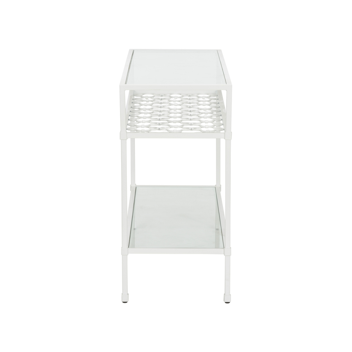 Narrow and sleek, perfect for displaying in your sitting room or entry way. The Pacific Coast Console is made of an iron frame finished with a white finish with two glass shelves, one on top and one below for the right amount of storage and display options. Designed by Bill Cain.
