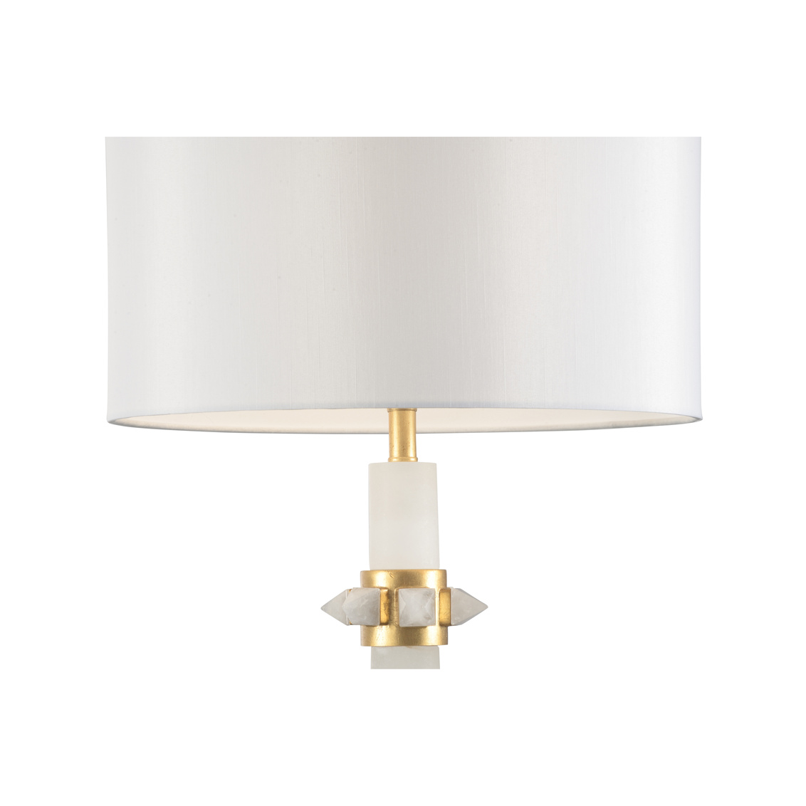 The Jackie Alabaster Lamp features a sophisticated column shape crafted from alabaster, exuding a sense of timeless elegance. Adorned with a crystal stone collar and exquisite gold leaf detailing, this lamp adds a touch of luxury to any space. Finished with a crisp white fabric shade.