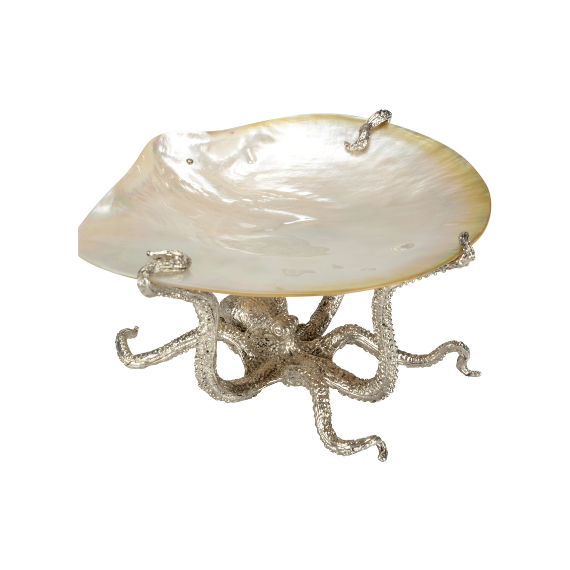 An octopus with unique details of silver plated body holding a kabibi shell tray. A fun accessory to add to any surface.