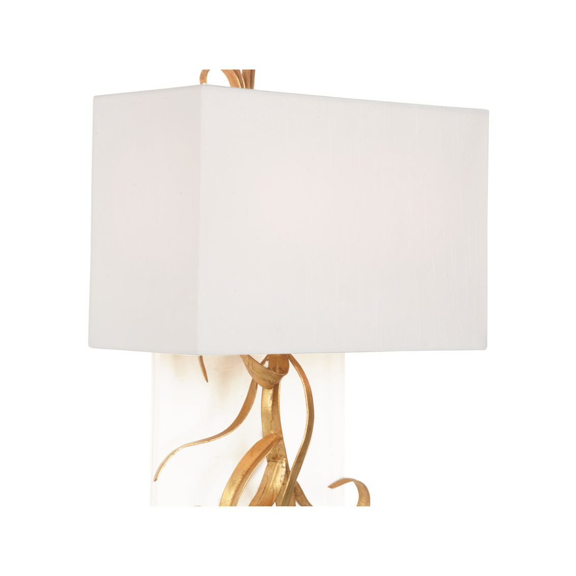 The Curling Leaves Sconce features delicate iron leaves, elegantly curled and finished in gold, resting against a sleek acrylic panel. Topped with a crisp white square shade, this sophisticated design combines natural elements with modern materials.