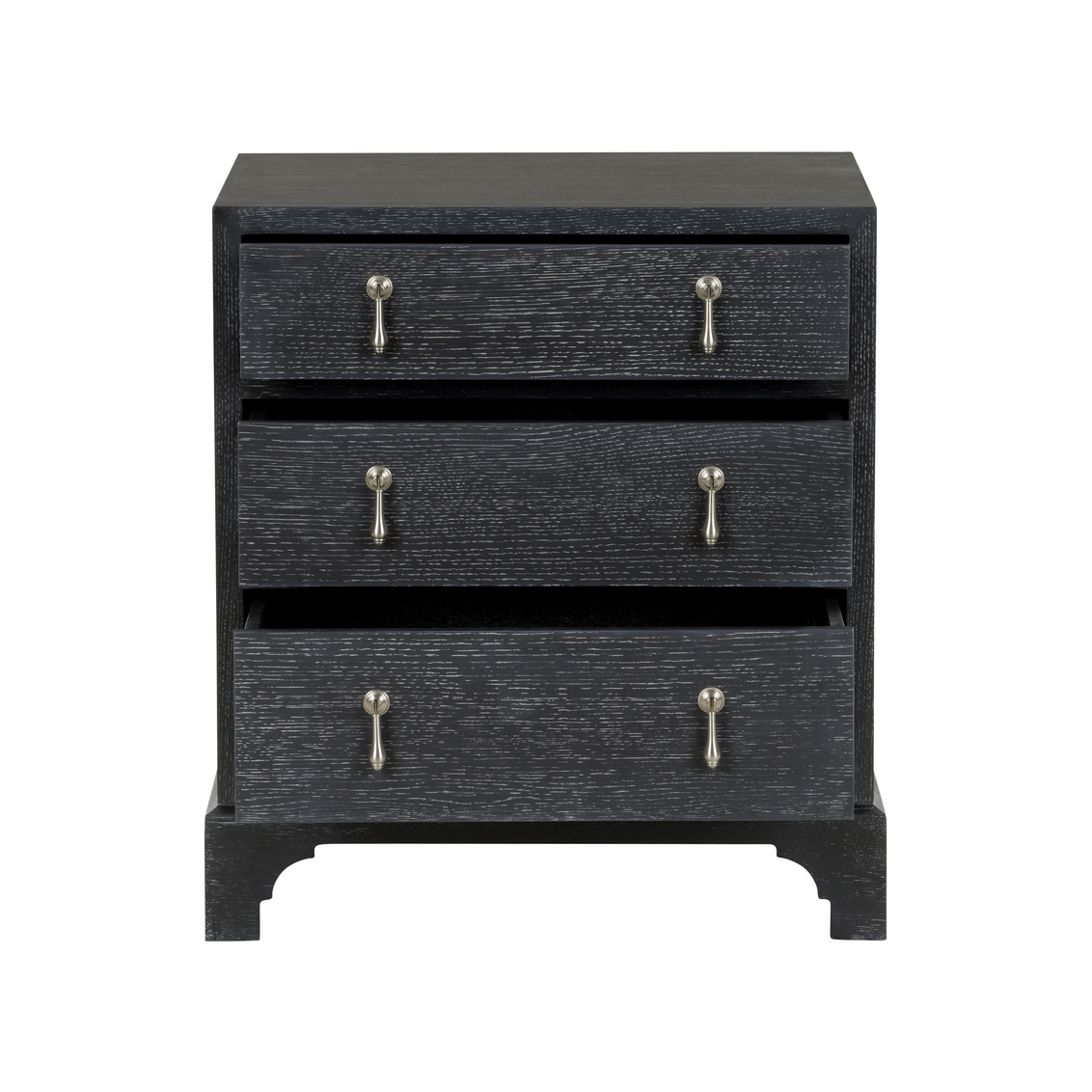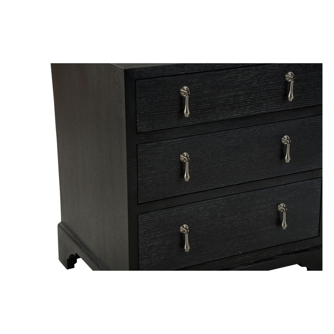 Based on an original from the South Carolina Low Country. Made fresh and update date in a natural Cerused Oak and black Cerused Oak with nickel drop pulls. Designed by Jamie Merida.
