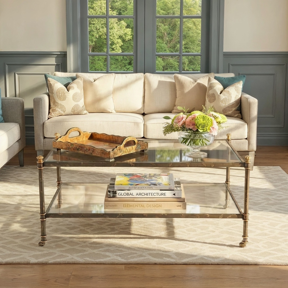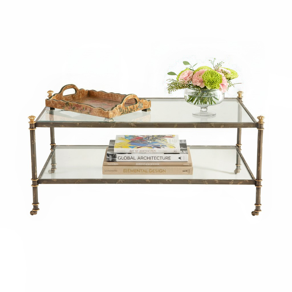 Sponged antique silver with glass top and shelf.