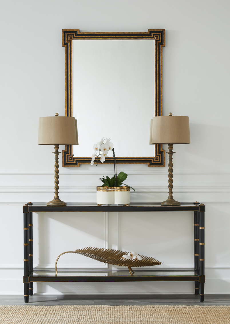 Beveled mirror with a rectangular black and gold wooden frame. Keyhole fasteners are provided for horizontal or vertical hanging.